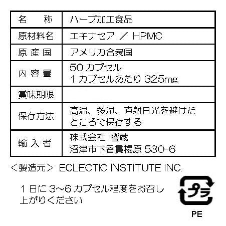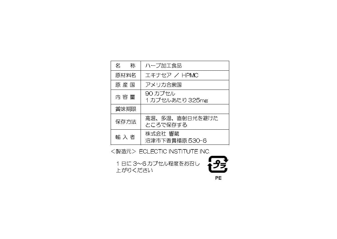 単価 あたり原材料:エキナセア(野生 アングスティフォーリアの根)/HPMC(カプセル素材)