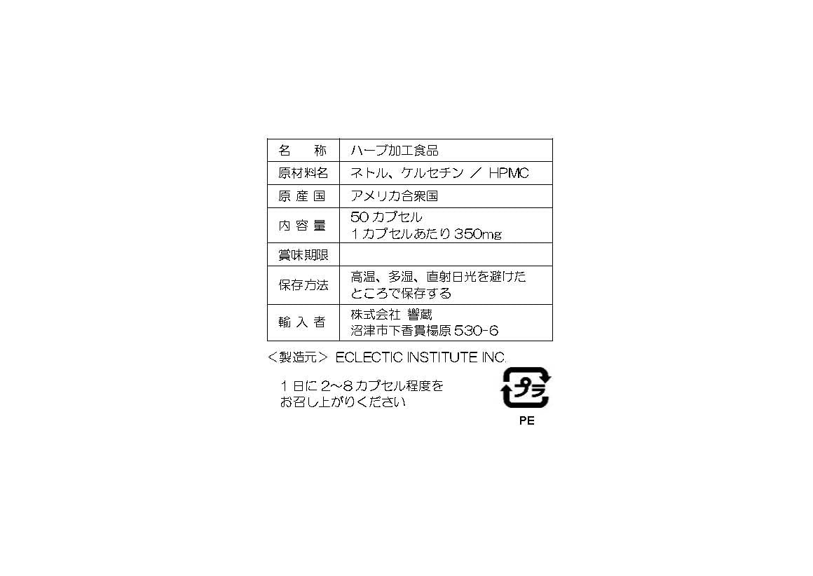 単価 あたり原材料:ネトル(野生イラクサの葉)、ケルセチン(植物由来)/ HPMC(カプセル素材)