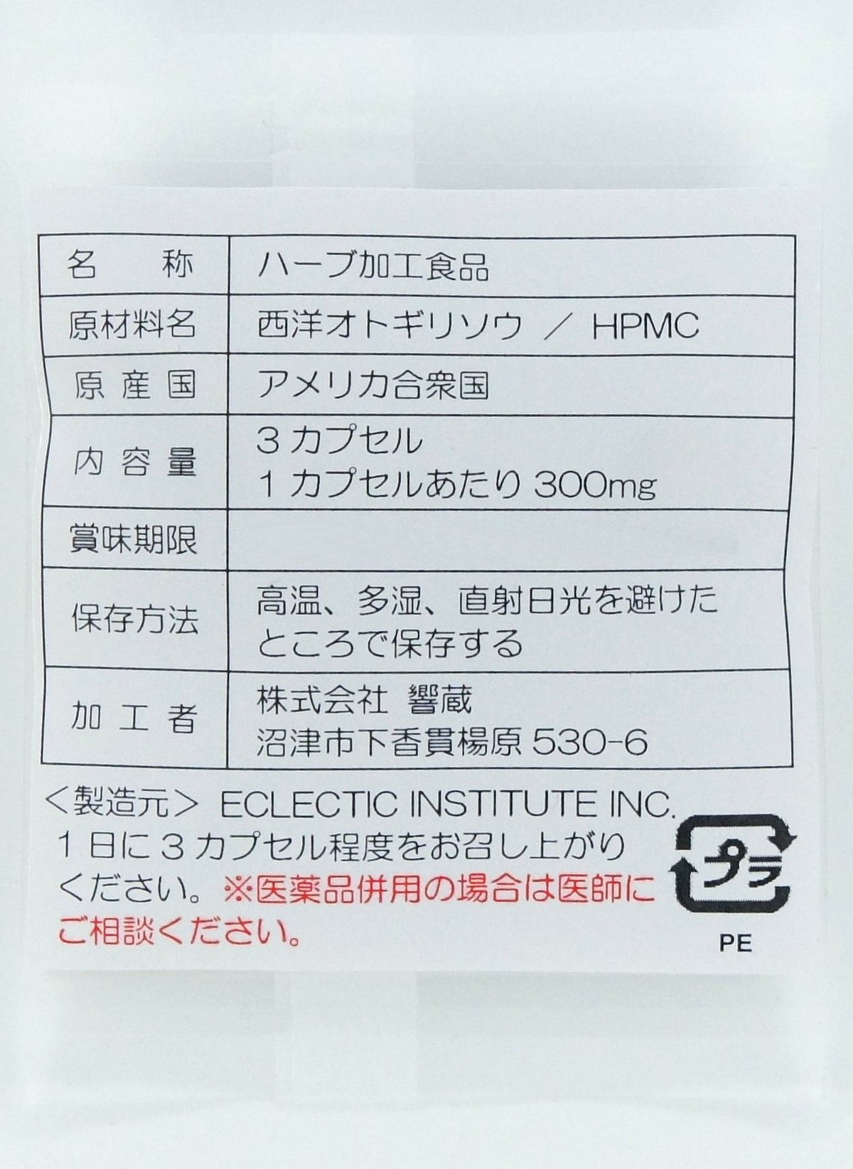 単価 あたり原材料:西洋オトギリソウ/HPMC(カプセル素材)