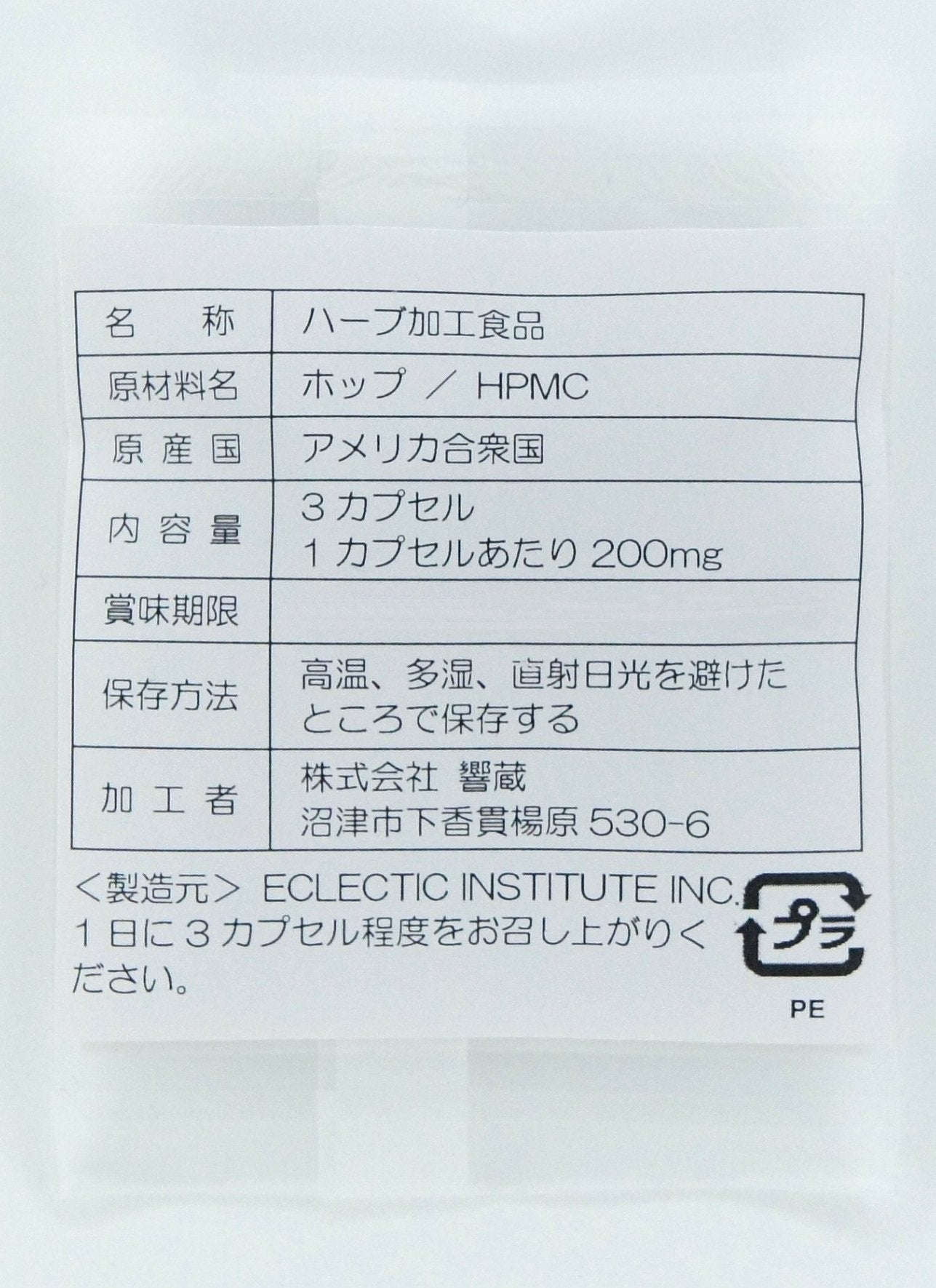 原材料:ホップの雌花(毬花)/HPMC(カプセル素材)